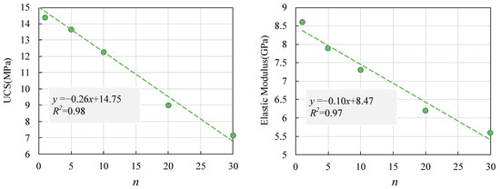 The changes in the modulus of elasticity of the mudstone with the number of freeze–thaw cycles are consistent with the uniaxial compressive strength, which decreases linearly with a smaller magnitude than that of the uniaxial compressive strength. After freeze–thaw cycles, the modulus of elasticity of mudstone is smaller than the corresponding value at room temperature (9.15 GPa).