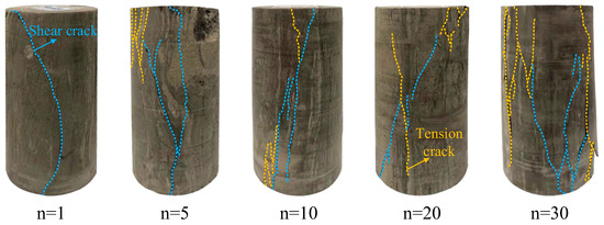 Sealed mudstone samples did not show significant damage characteristics after undergoing multiple freeze–thaw cycles, while natural mudstone samples exhibited specific patterns. The macroscopic damage characteristics of the samples under different numbers of freeze–thaw cycles are shown in Figure 12. There are longitudinally penetrating visible cracks on the samples. The number of macroscopic rupture surfaces of the samples increases gradually with the number of freeze–thaw cycles. Through the macrocrack characterization of the sample surface, the damage mode is summarized into two categories: shear damage (single-bevel shear injury and double-bevel shear damage) and tension damage (main crack parallel to the loading direction). When the number of freeze–thaw cycles is low, the sample is mainly dominated by shear damage; when the number of freeze–thaw cycles is high, the surface of the mudstone sample shows multiple parallel cracks expanding along the loading direction, with microcracks connecting between the shots, presenting a typical multisection tensile damage.