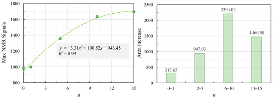 The peaks of the T2 spectra were counted for different number of cycles of the test to obtain Figure 6. From Figure 5 and Figure 6, it can be seen that for the confined mudstone, with the increase in freeze–thaw cycles, the distribution of T2 spectral curves is the same shape; all of them are single-peak type. The NMR peak signal corresponds to a significant increase in the chilling time, from 0.280 ms (initial state) to 0.300 ms (1 freeze–thaw cycle), 0.321 ms (5 freeze–thaw cycles), 0.601 ms (10 freeze–thaw cycles), 0.560 ms (15 freeze–thaw cycles). Meanwhile, the NMR T2 spectrum area increased significantly from 30,077 (initial state) to 30,394 (1 freeze–thaw cycle), 35,946 (5 freeze–thaw cycles), 52,117 (10 freeze–thaw cycles), and 53,548 (15 freeze–thaw cycles), with an increase of 1.05%, 19.51%, 73.27%, and 78.03%, respectively. The growth shows the law of rising first and then decreasing with the increase in freeze–thaw cycles when the number of freeze–thaw cycles is 6~10 times, and the average increase in pore volume of the confined mudstone samples is the largest with 7.327% per freeze–thaw cycle, which indicates that the pore volume expansion caused by water-ice phase change in the freezing process of the confined mudstone under the action of freeze–thaw cycles is different. With the increase in freeze–thaw cycles, the pore volume increases. The freeze–thaw damage accumulates, the pore volume grows with the increase in freeze–thaw cycles, and the freeze–thaw damage accumulates. With the rise in freeze–thaw cycles, the pore volume increases, and the freeze–thaw damage increases. Still, the pore volume increase rate shows the law of increasing first and then decreasing, and there is a maximum interval, which is between 6 and 10 times the freeze–thaw cycles in this test. With the continuous accumulation of freeze–thaw damage, the damaged pores gradually decrease under the condition that the total number of pores is certain.