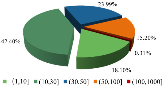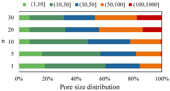 To more intuitively compare the change rule of different sizes of pores in confined mudstone samples under other numbers of freeze–thaw cycles, the pore diameters were divided into (1, 10], (10, 30], (30, 50], (50, 100], (100, 1000] (unit: nm, the same hereafter), and there were five groups. From Figure 14, it can be seen that the mudstone pores in the natural state are mainly concentrated in less than 100 nm, accounting for more than 99.6%, of which the pore sizes in the intervals of (1, 10], (10, 30], (30, 50], and (50, 100] account for 18.1%, 42.4%, 23.99%, and 15.20%, respectively.