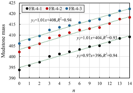 As depicted in Figure 16, an increase in freeze–thaw cycles leads to more natural mudstone samples undergoing the thawing process. During this process, water continuously penetrates the sample, causing the sample mass to increase gradually. Fitting curves for the sample mass changes during the three freeze–thaw cycles show that the group of natural mudstone samples grows linearly with the number of cycles. The water entering the piece moves to the voids between the mudstone skeleton, the pores between the clay mineral particles, and the interlayers within the clay mineral particles.