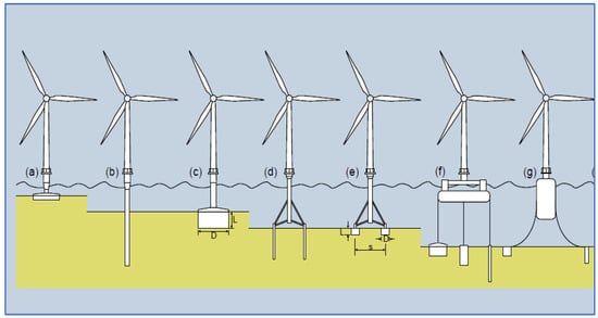 Available foundation options for offshore wind turbines. (a) GBF, (b) monopile, (c) suction caisson, (d) tripod/tetrapod piles, (e) tripod/tetrapod suction caissons, (f) multiple foundation options, and (g) guys with anchors [].