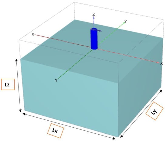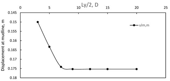 Once the final set of soil parameters were defined, the convergence analysis was carried out. The purpose of this convergence analysis was to test the FE sensitivity to the model domain boundaries and to increase the accuracy of the results, defining the reference geometry and mesh size that will be followed in the parametric analysis. Figure 3 shows the dimensions studied herein, while Figure 4 displays a typical set of results for the convergence analysis, and in this case, the effects of the model vertical boundaries in the y direction (transverse direction of the loading, Ly) on the displacement at the mudline, ulm (m). The same procedure was followed to define the length of the model, Lx, and depth of the model, Lz (Figure 3). In all the analyses considered, the global element size was set to be medium sized, and a refinement zone extending 3D, 5D, and 7D away from the center of the monopile and extending to the base of the model (zone of refinement in Figure 5) was investigated with changing coarseness factor (cf). This was completed to produce a finer mesh within the proximity of a monopile, where most of the strains were anticipated to take place. Based on the aforementioned convergence analyses, the selected boundary conditions are 7D for x, y from the pile centerline in all directions, with a refinement zone of 3D and cf of 0.2, yielding approximately 25,000 elements. This discretization of the domain provided good agreement with the practice reported by [].