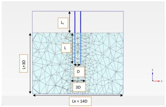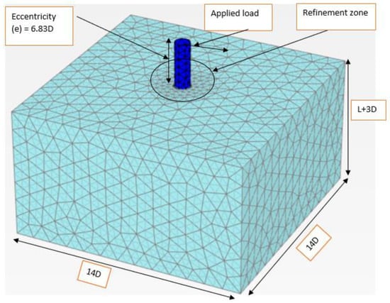 Based on the results of the sensitivity analysis, the vertical boundaries were placed at 7D from the center of the model and the bottom boundary was placed more than (3D) below the pile tip. The vertical boundaries were restricted horizontally and allowed to move vertically, while the bottom boundary was fixed in all directions (i.e., x, y, and z). These are standard model boundary conditions in Plaxis 3D and are used to remove any effects from the model boundaries on the structure response. The global mesh size was chosen to be medium sized after performing the sensitivity analysis, in which the FEM comprised 25,000 elements approximately. This was to ensure higher quality, yet time-efficient modeling. The mesh was further refined within a zone of 3D adjacent to the pile to increase the accuracy of the results. Figure 5 and Figure 6 show a typical mesh used in the study.