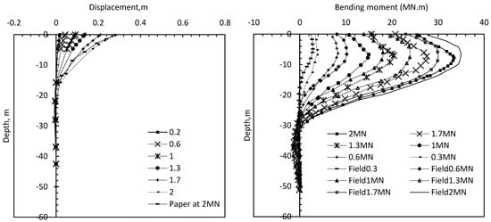 The load–displacement curve obtained from the FE analysis is plotted in Figure 7, along with the field data. Figure 7 demonstrates that there is excellent agreement between the calculated and measured load–displacement curves, validating the ability of the developed finite element model to simulate the behaviour of the large-diameter piles installed in the cohesive soil. Bending-moment and inclinometer data are also compared and excellent agreement is obtained as shown in Figure 8.