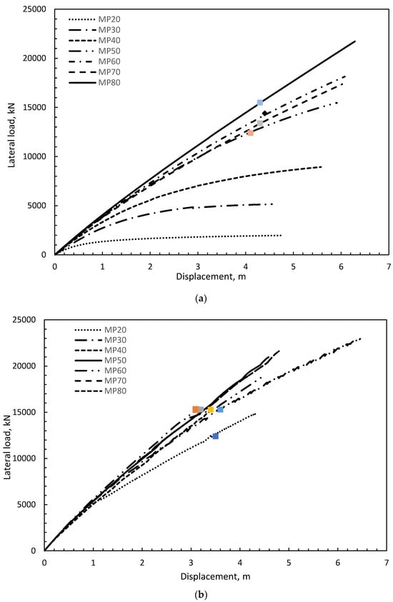 The load displacement curves for monopiles in soft clay (clay1) and hard clay (clay6) are displayed in Figure 10. It can be seen that both the stiffness and strength increased with increasing L/D ratio in the soft clay indicating rigid pile behavior, Figure 10a. In the hard clay, a less discernible increase in stiffness is realized when using longer monopiles and the strength gain is also minimal due to the flexibility of the pile with respect to the soil, Figure 10b. Since the pile elements are considered to behave elastically, the load displacement curve is limited at the points where the flexural bending capacity is reached within the monopile, i.e., the load displacement curve is not valid beyond these points (shown in Figure 10 as square and diamond points). It can be noticed that in both clays this phenomenon occurs, although to a lesser extent in the soft clay.