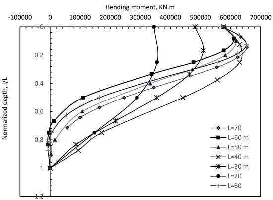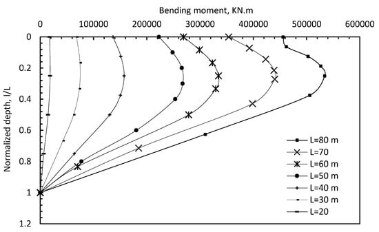 Examining bending-moment (BM) profiles for MP at lateral ultimate capacity can aid in assessing pile behaviour and determining structural failure. Figure 13 and Figure 14 display the bending-moment profiles for two soils, namely soil 1 and 6. Figure 13 presents the BM profile against normalized depth, l/L, for different pile lengths in a soft clay at the maximum lateral loads (Suo = 4.2 kPa). As expected, the piles behave rigidly in all cases, with the pile showing a toe kick in behavior and zero BM at the pile toe. In contrast, the piles behave rigidly for small L values up to 40 m and start to show a negative moment when the soil profile is stiff as shown in Figure 14 (Suo = 354 kPa).