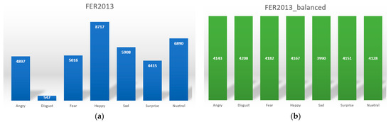 Class-wise image distribution in the FER2013 dataset: (a) the image distribution per class in the original FER2013 dataset; (b) the image distribution for the FER2013 balanced dataset.