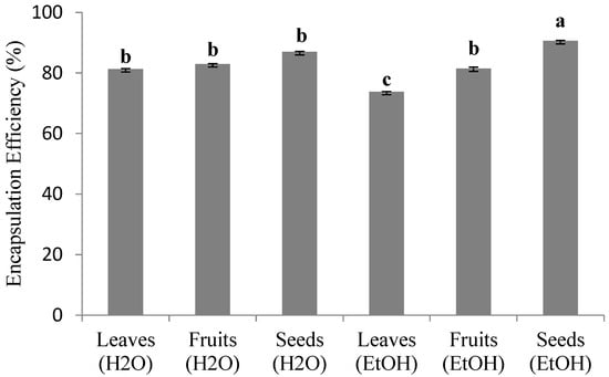 Encapsulation efficiency (EE) values of okra extracts. Data are shown as means and standard deviations (n = 3). The different lower-case letters indicate significantly different values (p < 0.05).