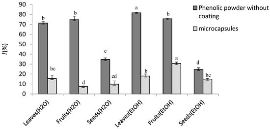 The total phenolic content of okra leaves, fruits and seeds are shown in Table 1. The results confirmed that all parts of Abelmoschus esculentus L. showed high concentrations of phenolic compounds in aqueous and ethanolic extracts, but the ethanolic solvent was more efficient than was the aqueous one in extracting phenolic compounds. The total phenolic content values ranged from 17.14 ± 0.42 mg GAE/g DW (aqueous seed extract) to 162.46 ± 4.48 mg GAE/g DW (ethanolic leaf extract). However, it is clear from the data presented in Table 1 that the total phenolic content was significantly (p < 0.05) higher in the okra leaf extracts. On average, the leaf extract accumulated two- and three-fold higher levels of phenolic compounds compared to those accumulated by the fruit and seed aqueous extracts, respectively. At the same time, the total phenolic content was two to four times higher in ethanolic extracts than that in aqueous extracts, which is in agreement with the findings of Liao et al. [38]. As shown in Table 2, the total phenolic content of microcapsules (TPCC) was lower than the phenolic content of uncoated phenolic powder. The total phenolic content of microcapsules ranged from 10.66 mg GAE/g (microcapsules of aqueous seed extract) to 17.47 mg GAE/g (microcapsules of ethanolic leaf extract). These results are consistent with those of the study by Saikia et al. [39], which highlighted a four-fold decrease in the phenolic content of orange powder after spray drying.