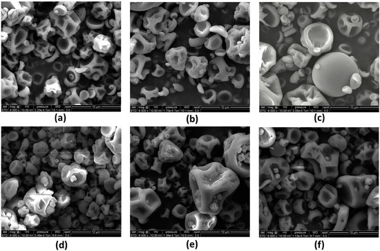 SEM micrographs of the microcapsules: (a) aqueous seed extract, (b) aqueous leaf extract, (c) aqueous fruit extract, (d) ethanolic seed extract, (e) ethanolic leaf extract and (f) ethanolic fruit extract.