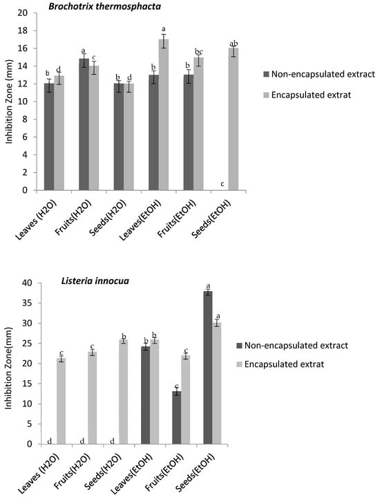Inhibition zones of non-encapsulated and encapsulated phenolic compounds from okra leaves, fruits and seeds. Data are shown as means ± standard deviation (n = 3). The different lower-case letters indicate significantly different values (p < 0.05).