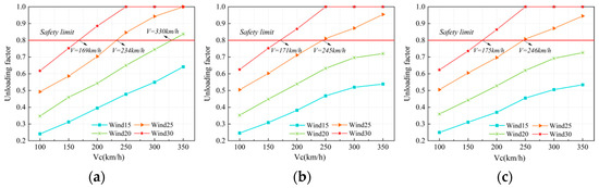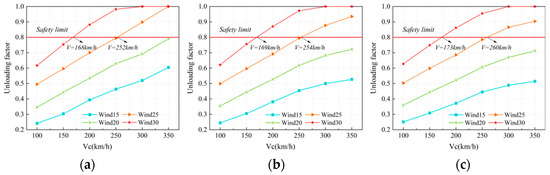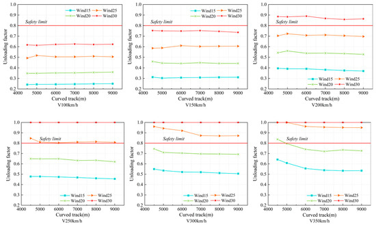 - The safety of the train is sensitive to the radius of the curve track when the curve passes under crosswinds. When the vehicle speed is less than 250 km/h, the unloading factor changes little with increasing radius. When the vehicle speed is 250–350 km/h, the maximum value of the unloading factor reduces with increasing radius. However, the reduction will be little when the radius exceeds 7000 m. Moreover, the safe speed of the train should be less than 250 km/h when the wind speed exceeds 25 m/s.