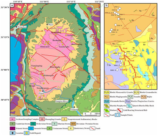 Geological map of the Huangling Anticline and sample point locations: (a) geological map of the Huangling Anticline and some gold deposit locations in the Huangling Anticline (the map was modified according to Cui et al., 2022 [35], Wang et al., 2023 [37], Institute of Geology, Chinese Academy of Geological Sciences, and Seventh Geological Brigade, Hubei Geological Bureau); (b) geological map of Mahuagou gold deposit and sample point locations.