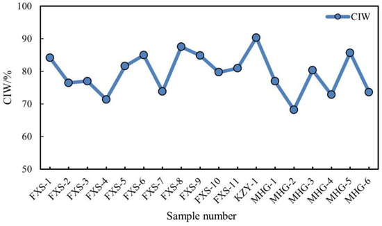 The calculated results are depicted in Figure 4. In general, CIW values between 50% and 60% indicate that the samples are fresh and have not undergone significant chemical weathering. If the CIW value of a sample exceeds 70%, it signifies intense chemical weathering [63]. The samples from the Mahuagou mining area consistently exhibit CIW values above 70%, indicating a pronounced history of substantial weathering processes.