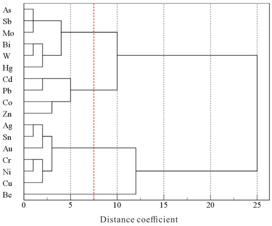 At a similarity level of 7.5 distance coefficient, all elements can be classified into four categories: The first category includes As, Sb, Mo, Bi, W, and Hg. Among them, the cooccurrence of Mo, W, and Bi elements is often associated with alkali granite related to W–Sn mineralization, consistent with the nature of soil parent rocks [70]. The combination of Hg, As, and Sb elements is closely linked to shallow, low-temperature hydrothermal mineralization, often manifesting as elements in the halo zone of hydrothermal gold deposits, serving as significant indicators for mercury, antimony, and gold deposits. This combination not only inherits the specific characteristics of the parent rock but also retains effective indicators of deep-seated mineralization. The second category encompasses Cd, Pb, Co, and Zn, which commonly occur in polymetallic sulfide hydrothermal mineralization and are also prominent lower-level elements in gold deposits [71]. The third category comprises Ag, Sn, Au, Cr, Ni, and Cu, forming a typical assemblage in medium-temperature ore-forming zones. Be elements constitute a separate category, typically acting as late-stage anomaly indicators in gold deposits.