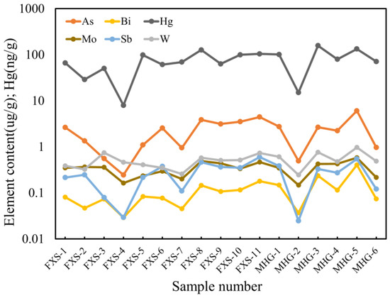 Even more, the cluster analysis displays the relationship between elements and rock types. The first category (As, Sb, Mo, Bi, W, and Hg) is closely associated with granite; it may indicate the crucial metallogenic significance of the biotite monzonitic granite (γPt3Zx) in the mining area. The second category (Cd, Pb, Co, Zn, Ag, Sn, Au, Cr, Ni, and Cu) is associated with mafic rocks and ultramafic rocks, and Au has displayed an affinity for such elements; this may indicate that the mafic-ultra mafic veins have a significant influence on gold mineralization. Further analysis is conducted on the variations of the complete dataset of the first three categories of element combinations along profiles. In Figure 7, it can be observed that the anomalous elements at the front edge of the gold deposit, composed of elements such as As, Sb, and Hg (Category 1), exhibit consistent anomalies in profiles FXS and MHG.