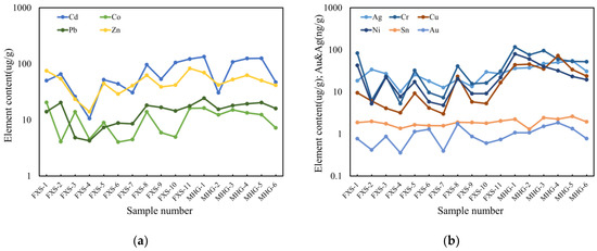 The content change characteristics of the second combination elements and the third combination elements: (a) variation characteristics of Cd, Co, Pb, and Zn content; (b) variation characteristics of Ag, Cr, Cu, Ni, Sn, and Au content.