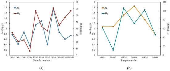 The soil heat-released mercury survey method involves heating the soil to release mercury that is adsorbed within the soil and is related to mineral bodies. Subsequently, the released mercury content is measured. This approach, combined with geological and mineralogical characteristics, allows for the further analysis of concealed mineral bodies or underlying structures. In this exploration study, soil heat-released mercury surveys were conducted in two locations near the Fengxiangshugou (FXS) induced IP profile and the Mahuanggou (MHG) mining area along Line 7 in the core area of the Huangling Anticline gold deposit. The results were compared with the gold content in the soil (Figure 9).