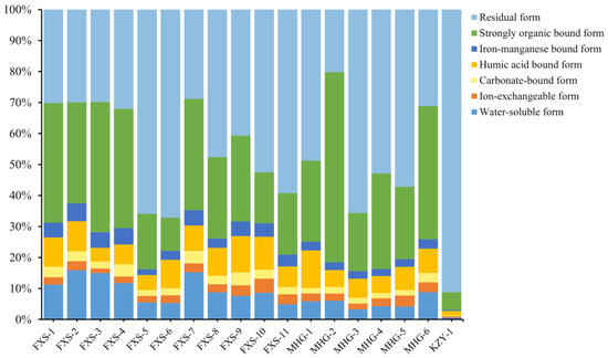 In this exploratory study, the gold fractionation of 18 soil samples from three locations—Fengxiangshugou (FXS), Mahuanggou (MHG), and Kaziya (KZY)—was conducted using the seven-step sequential extraction method. The ratios of gold content in different fractions to the total mobile gold content are illustrated in Figure 10.