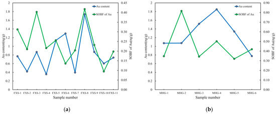 Line chart of the strong organic bound form (SOBF) of Au and Au content in soil: (a) anomaly of SOBF of Au in Fengxiangshugou; (b) anomaly of SOBF of Au in Mahuanggou.