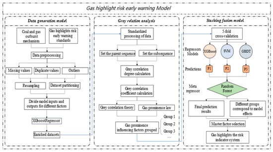 This paper introduces the basic theoretical part of the gas outburst risk warning model, including the process and principles of grey relational analysis and the XGBoost, SVM, GBDT, and random forest algorithms. Then, a gas outburst risk warning model is constructed based on stacking ensemble learning. The construction process for this model consists of three parts. The first step is to build a data generation model based on XGBoostRegressor to expand the capacity of the original dataset. The second step is the selection of main control factors based on grey relational analysis. The factors with the highest grey correlation coefficients, indicating the greatest relevance to coal and gas outburst risks, are selected from a set of 20 indicators. The third step is to construct a warning model based on the stacking fusion algorithm framework. Through the implementation of XGBoost, SVM, GBDT, and random forest as the four learners, an effective warning for coal and gas outburst risks is achieved. Furthermore, sufficient experimental analysis is conducted, and the model’s performance is analyzed to select the factors that most influence gas outburst risks. Finally, the experimental results are summarized and analyzed.