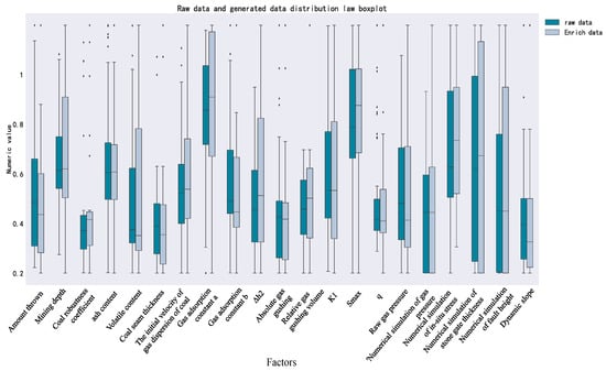 By comparing the distribution of the original data and the extended data, it was found that the distribution interval of the 20 indicators of the extended data was basically consistent with the distribution interval of the original data, indicating that the extended data was consistent with the distribution of gas outburst indicators in the mine, had strong credibility, and could be used for the construction of the gas outburst warning model.