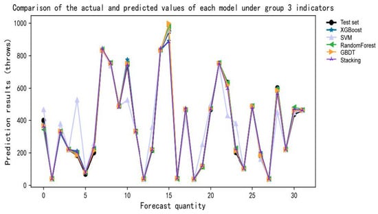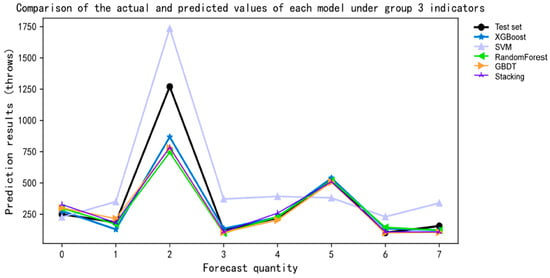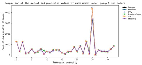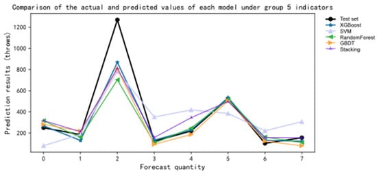 For the fifth group of indicators, the XGBoost predictive model exhibits an MAE, MSE, and R2 of 0.121, 0.121, and 0.92, respectively. The SVM predictive model shows an MAE, MSE, and R2 of 0.333, 0.333, and 0.781, respectively. For the RF predictive model, the MAE, MSE, and R2 are 0.091, 0.091, and 0.94, respectively. The GBDT predictive model demonstrates an MAE, MSE, and R2 of 0.091, 0.091, and 0.94, respectively. Lastly, the stacking predictive model yields an MAE, MSE, and R2 of 0.152, 0.152, and 0.9, respectively. As shown in Figure 8.