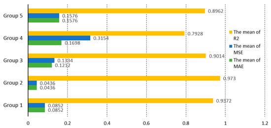 By plotting bar charts for the average MAE, MSE, and R2 of the five datasets, it is visually evident that the second group of metrics performs optimally. Specifically, the MAE, MSE, and R2 for this group are 0.0436, 0.0436, and 0.973, respectively. On the other hand, the fifth group exhibits the poorest performance with MAE, MSE, and R2 values of 0.1576, 0.1576, and 0.8962, respectively. As shown in Figure 9.