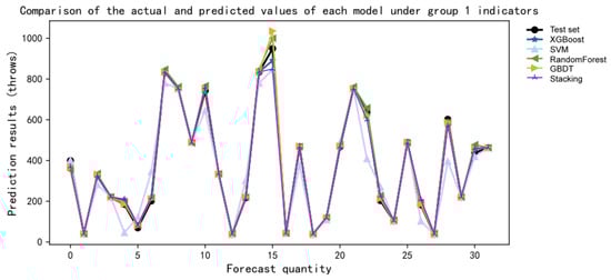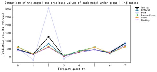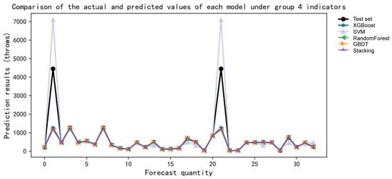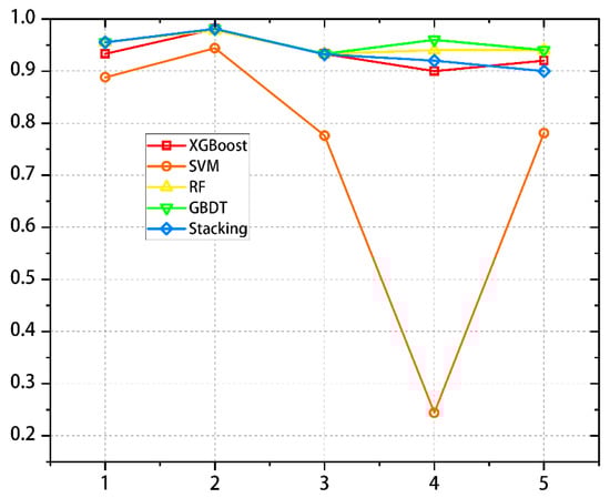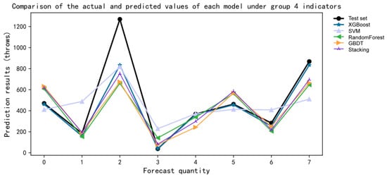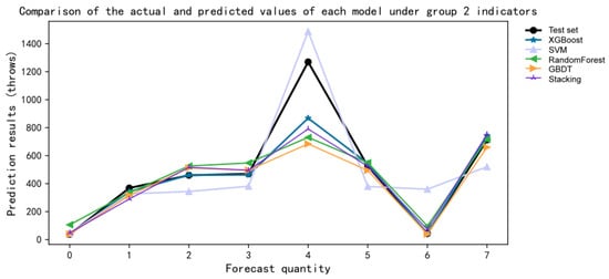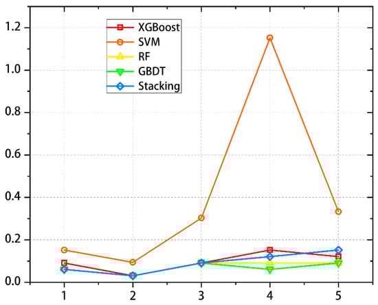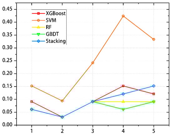 By drawing five models, it was concluded that the change about MSE values for the different data groups directly reflected the prediction effects of the different indicator groups in each model. By comparing the five points on the same line, it was found that the MSE value of the second indicator group was the smallest, while the MSE value of the fourth indicator group was the largest in SVM and XGBoost. The MSE value of the fifth indicator group in stacking, RF, and GBDT was the largest. As shown in Figure 11.