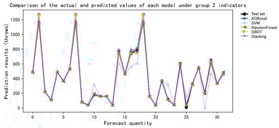 By drawing five models, it was concluded that the change in R2 values for the different data groups directly reflected the prediction effects of the different indicator groups in each model. By comparing the five points on the same line, it was found that the R2 value of the second indicator group was the largest, while the R2 value of the fourth indicator group was the largest in SVM and XGBoost. The R2 value of the fifth indicator group in stacking, RF, and GBDT was the largest.