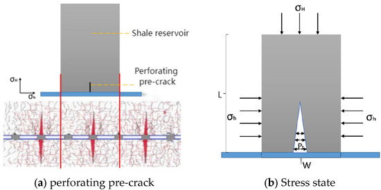 HEGF generally forms a pre-fracture through perforation, and then injects a liquid drug into the perforation section to generate a large amount of high-temperature and high-pressure gas after ignition, which exerts an effect on the pre-fracture and further expands and extends it, as shown in Figure 1a. According to the physical model, the geometric model of fracture propagation in high-energy gas fracturing of horizontal wells is defined, as shown in Figure 1b. σH is the maximum principal stress, σh is the minimum principal stress, L is the reservoir length, W is the reservoir width, and Pt is the gas pressure distribution in the fracture [3].
