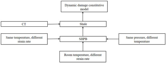 The physical and mechanical properties of shale exhibit significant anisotropy, impacting the design and construction of high geothermal tunnels and deep resource mining. The research on the stress–strain relationship of shale under different conditions and different strain rates is not perfect domestically and abroad. Therefore, this paper took shale from the Sichuan Basin as the research object and conducted Hopkinson bar compression experiments at normal temperature, 60 °C, 90 °C, 120 °C, and 150 °C, and at three groups of air pressures of 0.2 MPa, 0.3 MPa, and 0.4 MPa. The differences and similarities of the stress–strain effects of shale under the same strain rate with different temperatures, and the same temperature with different strain rates, were analyzed in depth. Based on the experimental results, a constitutive model considering shale temperature was established. The research results can provide an important theoretical basis for the strength, fracture, and deformation theory of shale. The research process is shown in Figure 2.