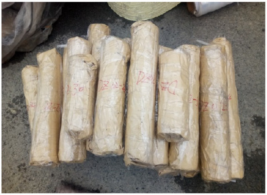 The samples were taken from Liutang Township, Shizhu County, Chongqing, on the edge of the Sichuan Basin, which can better represent the rock profiles of black shale. Engineering bricks with an inner diameter of 56 mm were used for core sampling and a core length of 150 mm. The cores were quickly sealed with cling film and kraft paper and sampled and numbered after being taken out for use and subsequent processing later. The sampled shale is shown in Figure 3. The rough sampling method described above leads to various defects in the cores and therefore requires secondary machining to meet the strict requirements of the SHPB test that the specimen must be in close contact with the incident bar and transmission bar. The finishing process ensured that the final experimental specimens have a more uniform length, a flatter section, good parallelism, and no bending of the specimens. The processing apparatus used was a C6132 machine Ltd. (Tengzhou, China) [30] of Yunnan Yunji Group Import & Export Co., Ltd. (Yuxi City, China) to finely process the sample. The cores were machined into standard rock samples with a height of 50 mm and a diameter of 50 mm, and the tolerance of dimensions, parallelism, and diameter were ± 0.02 mm.