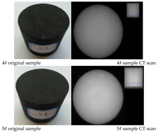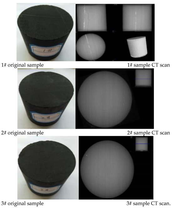 Five groups of CT scans of the shale were analyzed. A comparison of the original shale samples and CT results is shown in Figure 4, showing the original and scanned images of samples 1# to 5#. The 1# original sample has obvious impurities and small radiating cracks, which could be seen clearly through the CT scan. No cracks were observed in the original sample of 2#, but the CT scanning results showed that the cracks were located to the right of the center of the shale circle and did not penetrate the sample. The original samples of 3# and 4# were observed via visual and CT scans to have distinct joints’ planes, and the joints’ planes were roughly parallel. The 5# sample was relatively dense overall, with little tramp mass. Based on the CT scan results of the shale, there was a high probability of defects, such as joints and fractures, in the shale itself, but the shale was relatively dense throughout. It can be inferred that the existence of defects in the shale itself has a certain impact on its mechanical properties.