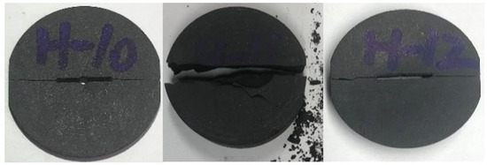 Figure 5 shows the final failure diagram of the specimen with a loading angle of 0°. The test starts from the initial crack tip during the loading process, and gradually expands to form a “one” shape main crack with the increase in the load. The principal crack expansion morphology of the three specimens was similar. With the increase in load in the initial crack during loading, stress concentration occurs in the crack tip region. When the initial crack tip reaches the condition of cracking, the initial crack tip begins to crack and extends to the upper and lower ends of the loading along the diameter loading direction, forming a through principal crack that divides the specimen into two parts. Due to the Poisson effect in the loading process of the specimen, when the effective tensile stress exceeds the tensile strength of the specimen, the splitting tensile failure occurs along the diameter of the loading plane. Figure 5 shows the final failure diagram of the specimen with a loading angle of 0°. Table 2 shows the splitting tensile strength of shale.