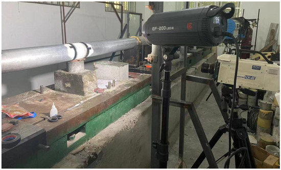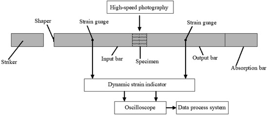 At present, a split Hopkinson pressure bar is commonly used to test the dynamic characteristics of brittle materials, such as concrete and ceramics [32,33,34]. The impact experiment of the shale was carried out using a SHPB device with a diameter of 50 mm. The test was carried out on the split Hopkinson experimental system in the structural dynamics laboratory of Southwest University of Science and Technology. It is mainly composed of a bullet, an incident bar, a specimen, a transmission bar, an absorption bar, a measuring device, and a data processing system. The schematic diagram of the experimental device is shown in Figure 6, where the lengths of the bullet, incident bar, and transmission bar are 600 mm, 3000 mm, and 3000 mm, respectively. Each bar has a diameter of 50 mm and is made of a steel alloy with a modulus of elasticity (E) of 72 gPa, a yield strength of 300 MPa, and an ultimate strength of 460 MPa. The shale specimen was placed between the incident bar and the transfer bar, where the contact surfaces are parallel. Strain gauges were installed on the incident bar and the transmission bar to collect waveform data. The actual experiment is shown in Figure 7. The position of the strain gauge was two times the length of the bullet from the incident end face. The strain gauge of the incident bar and the strain gauge of the transmission bar were symmetrical with respect to the specimen.