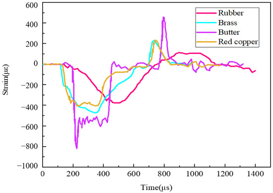 In the process of the waveform shaping experiment, according to the experience of predecessors [35], butter, copper, brass, rubber, and other materials were added to the front end of the incident bar to shape the curves. The circular sheets with a diameter of 15 mm and a thickness of 2 mm were prepared, and the SHPB empty bar experiment was completed, and the incident waveform diagrams of the different materials are shown in Figure 8.