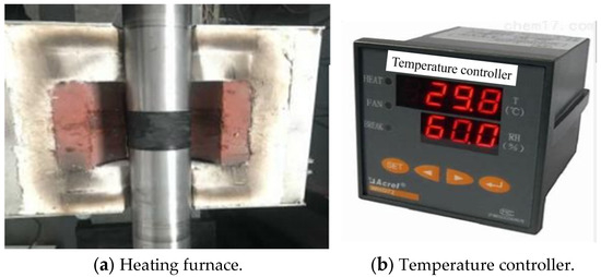 At present, there are few SHPB compression experiments on shale with temperature. High-temperature dynamic mechanical experiments have been proposed much earlier. As research on the dynamic mechanical properties of brittle materials has increased, SHPB experiments on concrete and rock at high temperatures have gradually increased, but SHPB experiments on shale with temperature are very rare. Previous research has indicated that the shale reservoir in the Sichuan Basin is approximately 1500–4000 m, and that the temperature of the shale reservoir reaches 150 °C at this depth. Therefore, several groups of tests at different temperatures have been designed to investigate the dynamic mechanical properties of the shale. The shale heating device is equipped with the SHPB experimental procedure described above. The heating furnace and temperature controller are shown in Figure 9.