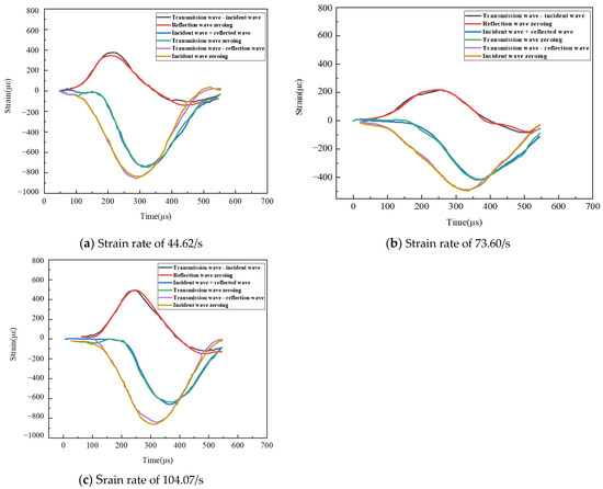 where , and represent the incident stress wave, reflected stress wave, and transmitted stress wave, respectively. When the data were processed, the corresponding incidence curve, reflection curve, and transmission curve were used to replace the calibration, and the results are shown in Figure 10.