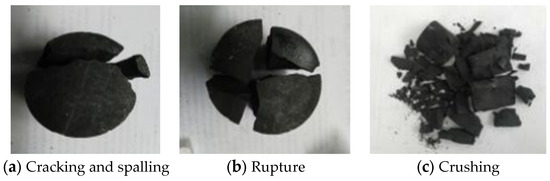 When the impact pressure of the test was 0.2 MPa, the bullet velocity was 4.025 m/s, and the average strain rate was 44.62/s. As shown in Figure 10a, the specimen is slightly spalled and cracked locally under the impact pressure, but the specimen is not damaged. This phenomenon is called “cracking and spalling”. When the impact pressure was 0.3 MPa, as shown in Figure 10b, the average strain rate was 73.6/s, and the whole specimen was divided into several large pieces, which can be considered damaged; we called this “rupture”. When the impact pressure was 0.4 MPa, the average strain rate reached 104.07/s, as shown in Figure 10c; the specimen was completely crushed under the impact pressure, and the main body of the specimen was completely divided into powder and blocks. This kind of phenomenon is called “crushing”. Therefore, it can be concluded that the damage degree of the shale intensifies with the increase in impact pressure.