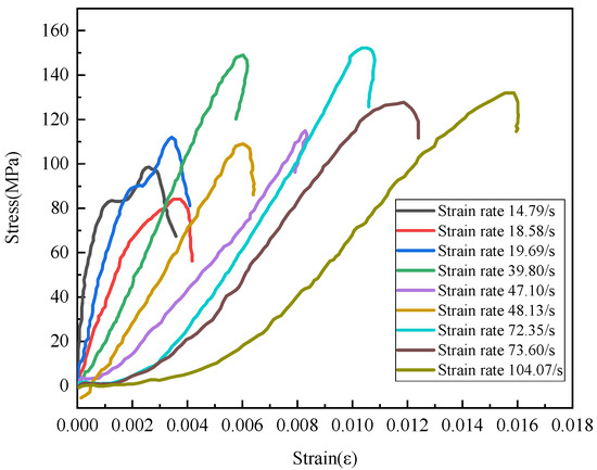 The validity of the experimental data was verified through a large number of SHPB experimental tests, and the stress–strain curves of the shale at room temperature were obtained, as shown in Figure 12.