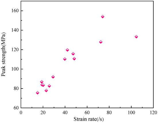 Concrete materials are sensitive to strain rates, and it is an important task to study the dynamic properties of concrete. Current studies generally agree that the dynamic tensile and compressive strength of concrete increases with increasing strain rates [37,38,39]. According to the peak strength of the shale under different strain rates, it can be found that the dynamic compressive strength of the shale has a strong strain rate effect, especially when the strain rates are between 10/s and 100/s; moreover, the peak strength of shale presents a linearly increasing trend with the increase in strain rates, which is similar to that of concrete materials, indicating that shale is also a rate-sensitive material.