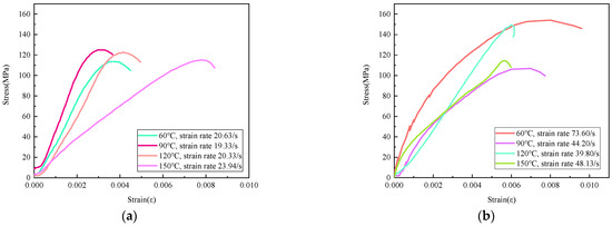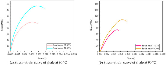 Figure 14a–d show the stress–strain curves of shale under the different strain rates at 60 °C, 90 °C, 120 °C, and 150 °C, respectively. It can be seen that the peak stress and ultimate strain of the specimens increase with the increase in strain rates at the same temperature condition, showing the correlation. This phenomenon is called the strengthening effect of strain rate on the impact compression mechanical properties of shale materials.