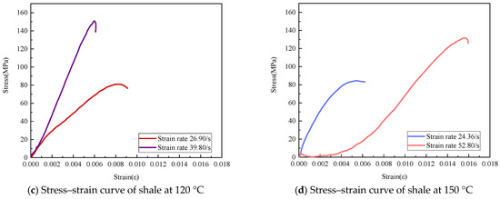 Figure 15 shows the stress–strain curves of shale specimens under the same pressure at different temperatures. It can be seen from Table 3 and Table 4 that under the same impact pressure condition, within the temperature difference range of this experiment, the dynamic strength of the specimen presents two opposite trends (increase and decrease) with the increase in temperature, which is determined by the direction of bedding [10]. As shown in Figure 14a, when the strain rates are close, the strain of shale will increase with the increase in temperature, especially when the temperature is 150 °C, and the corresponding strain value is much larger than that at 60 °C, 90 °C, and 120 °C. This indicates that shale will soften when the temperature exceeds 150 °C, resulting in an increase in strain, with the corresponding elastic modulus and hardness decreasing. Through calculation, it can be found that the elastic modulus of shale at 150 °C is 2–3 times smaller than that at 60 °C, 90 °C, and 120 °C, indicating that temperature will greatly affect the elastic modulus of shale and, thus, affect the hardness of shale.