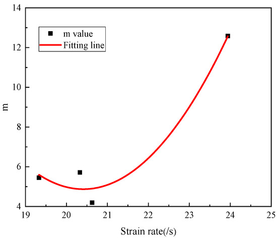 The relationship between , and the strain rate can be established, which can effectively modify the failure statistical constitutive model of shale. Scatter plots were drawn with and as the ordinates and strain rate as the abscissa, respectively, and nonlinear fitting was carried out, as shown in Figure 16 and Figure 17.