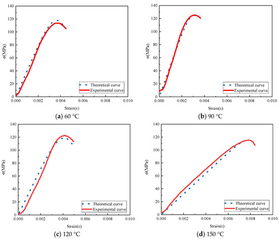 From the model validation results, the theoretical curves are consistent with the experimental curves at the same strain rate. Based on the effect of the Weibull distribution parameters and , a reasonable correction of the theoretical curve can better reflect the insensitivity of the peak stress of the shale to temperature. The modulus of elasticity decreases with increasing temperature. Notably, the shale modulus of elasticity significantly decreases at 150 °C. Of course, the model established in this paper cannot fully express the changing process of the dynamic stress–strain curves of the shale at each loading stage, and there are some limitations due to the limited data available. The errors caused via the determination of the model parameters and the choice of elastic modulus need to be further improved in future studies.