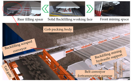 In the solid backfilling working face, the roof is supported by the solid backfilling mining hydraulic support (SBMHS). The front space is used for coal mining, and the rear space is used for backfilling. The gangue materials used for filling are transported by the belt conveyor for transporting gangue from the tail gate to the backfilling scraped conveyor, and then dumped to the gob area and then compacted densely by the tamping mechanism of the SBMHS [29], as shown in Figure 1.