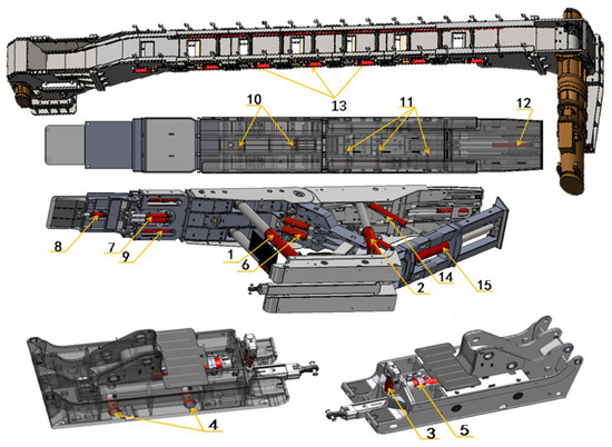 The names of the hydraulic cylinders No.1–15 in Figure 2 are 1. front column; 2. rear column; 3. bottom-lifting jack; 4. bottom-adjustment jack; 5. push jack; 6. equilibrium jack; 7. first-level protection jack; 8. secondary protection jack; 9. hydraulic support telescopic beam jack; 10. front roof beam-side push jack; 11. rear roof beam-side push jack; 12. expansion jack of the backfilling scraped conveyor; 13. discharge jack of the backfilling scraped conveyor; 14. swing beam jack; 15. compaction jack.