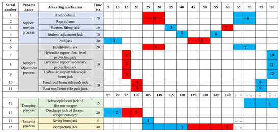 During the field measurement at the Xingdong Mine, the actuating time of a four-column, four-bar linkage backfilling mining hydraulic support was averaged. The results were used for a quantitative analysis of the actuating time of the cylinders and the time gaps between cylinder actions. The action sequence of the cylinders is optimized. The time sequence of the actions of all cylinders in a complete process cycle for a single support is designed, as shown in Figure 5.